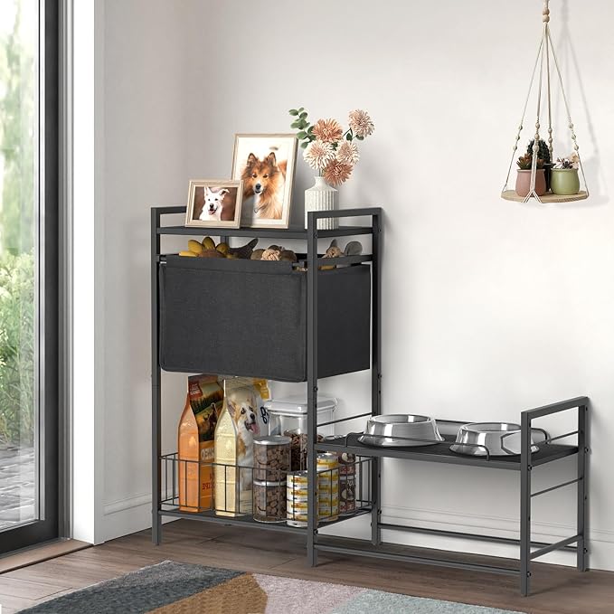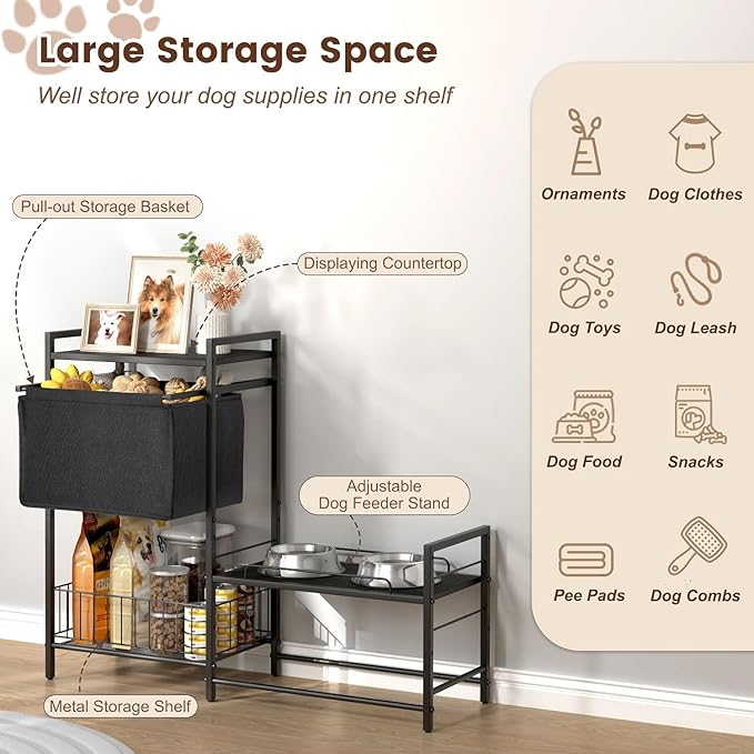 - š¾ćAll in One Elevated Dog Bowls Stand with StoragećThis raised dog bowl stand consists of a dog feeding station, a countertop, a metal storage basket and a pull-out dog toy bin that provide ample room to store the dog supplies in a unified location, keeping the dog food, cans, toys, jackets and other dog essentials together and easy to take up. The combination of the dog bowl stand and dog storage organizer is really convenient to keep everything organized and maximize the use of limited space.