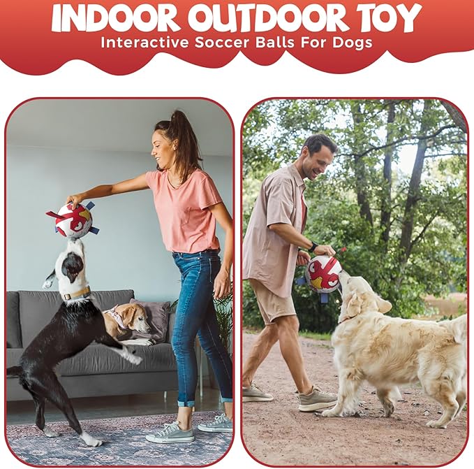 - 【🐶🐶Upgrade Interactive Dog Toy】Dog soccer ball with nylon tabs sewn evenly into the seams not only create an erratic bounce that your dogs love to chase,but also make it easier for your dogs to fetch, toss, tug and retrieve.Dog paws are printed evenly on the dog toys ball to attract your dog attention.There's a longer strap for you to hold the ball,making it a great interactive dog toy to train your dogs.