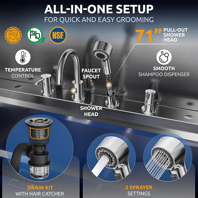 - ALL-INCLUSIVE BATHING SYSTEM: Groom-ready out of the box! Our dog wash tub comes fully equipped with a Premium Faucet, 71" pull-out sprayer, shampoo dispenser, and a drain kit with hair trap. Everything you need for a pro-level wash at home or salon
