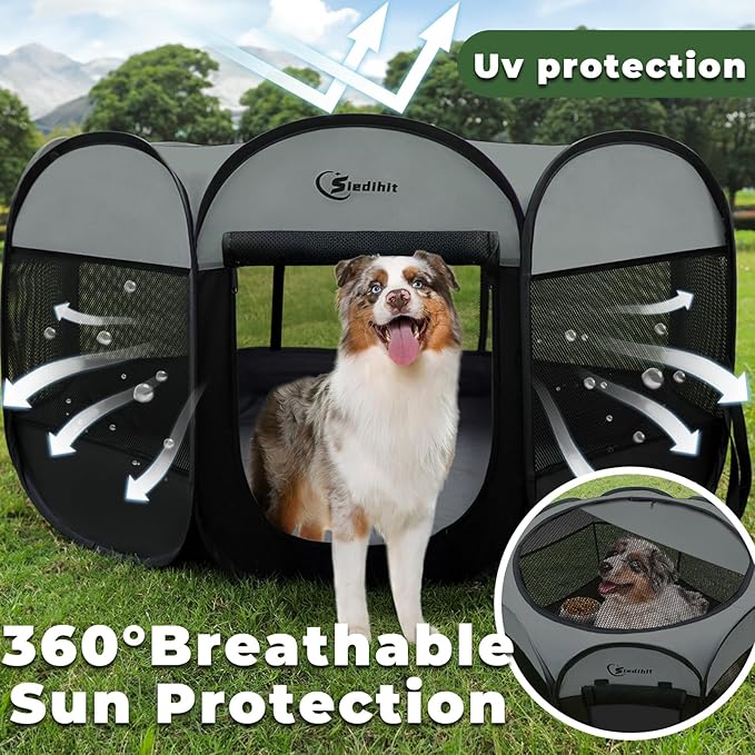 - 【No Assembly required】Opening the dog pen takes only a few seconds, is lightweight, strong, and does not require assembly. When not in use, it can be folded into the tote bag provided by us, which takes up minimal space and is easy to carry and store. Spacious interior Spaces allow your pet to play, sleep, hide or isolate. Perfect for indoors, lawns, beaches, parks, Tours, camping and more!