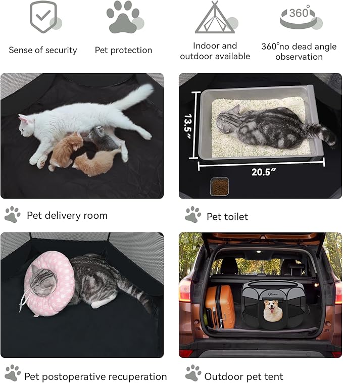 - 【Safe quality material】The pet playpen is made of high-grade thick mesh and 600D polyester Oxford cloth, made of durable waterproof material. Seams and corners are reinforced, not easily damaged by pets. Consists of 8 mesh side panels and a half mesh top, well ventilated. You can have a 360-degree view of your pet's condition, and you can also give your pet a panoramic view of its surroundings.