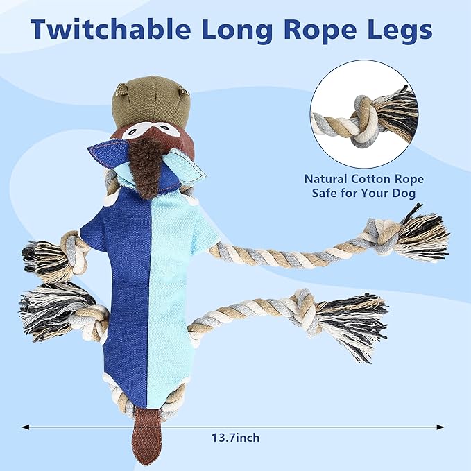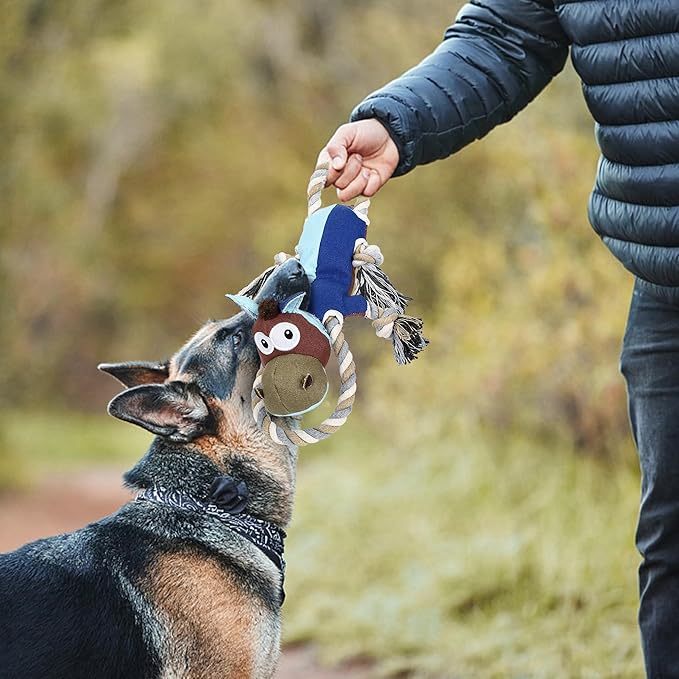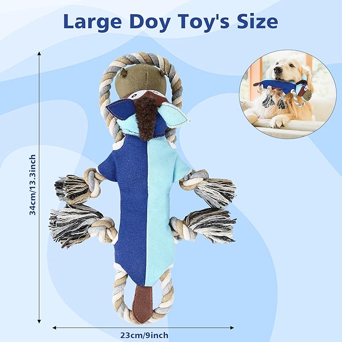 - 【Large Size and Long ropes】 The dog toy for large dogs is 13.3*9 inch,larger than most of the dog toys.It has two long twitchable ropes with lenth 13.7 inch,which could move insed the toy.This big dog toys are perfect for tug of war and other interactive games It has a built-in squeaker,which helps entice your dogs play for extra excitement and make them feel less bored.