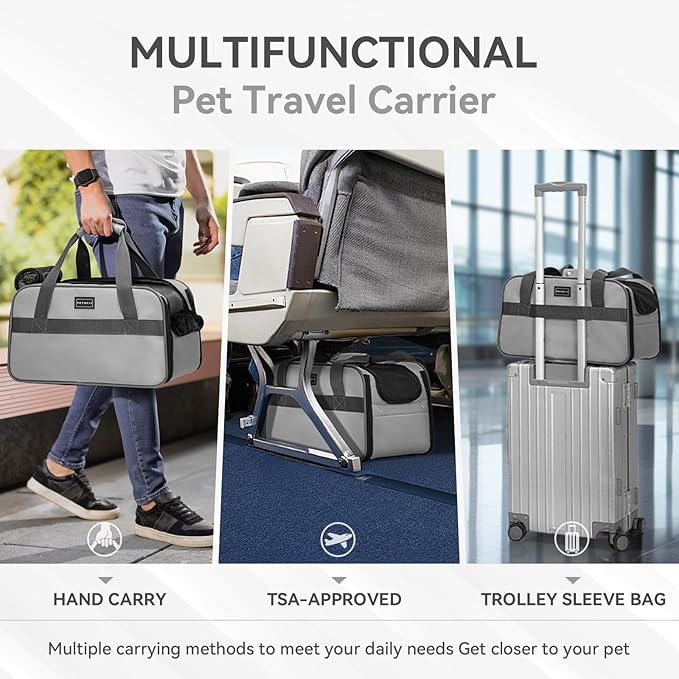 - [Drive with Less Distraction] Keeping your pet safe on the go is our top priority. The adjustable safety tether, enhanced with a large hook, ensures your pet is securely anchored. The pet carrier airline approved comes with a lockable zipper for added security and is constructed with an internal steel frame, providing peace of mind during your travels.