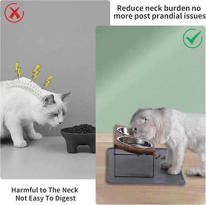 - 【Pet Safe Material】The cat food and water bowl set are made of premium food-grade stainless steel bowls which are rust-resistant and removable. Dishwashers safe and easy to clean. Natural and odor-free wood is waterproof and durable.