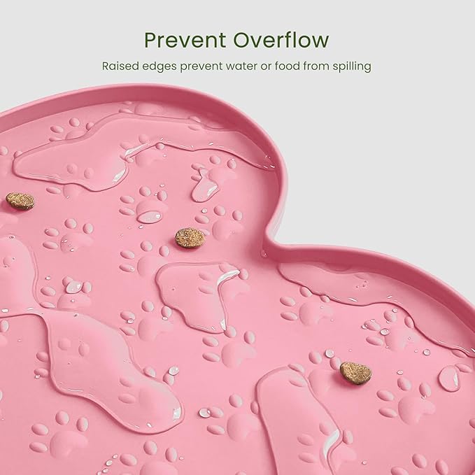 - Raised Edge - The high edge of this feeder mat keeps food and water within the tray and prevents spillage onto a clean floor. Keep your living space tidy and clean, say goodbye to messy floors, you just need to clean the dog bowl mat regularly.