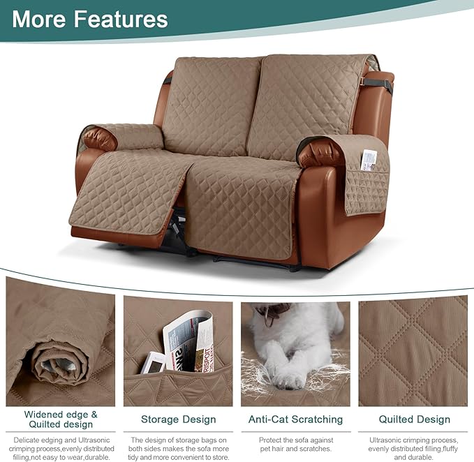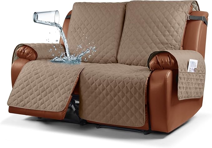 Ruaozz Waterproof Recliner Sofa Cover 1-Piece Couch Covers for Reclining Couches Reclining Sofa Cover Washable Furniture Protector with Elastic Straps Pocket for Kids, Pets (Light Brown, 2 Seater)