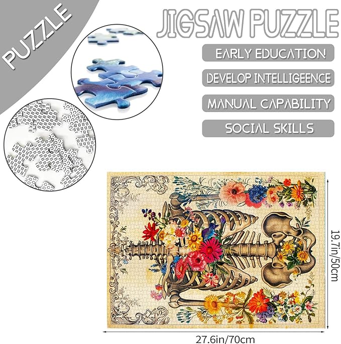 Rib Cage Skull Flower Jigsaw Puzzle Human Organ/Anatomy 1000 Pieces Puzzles Game Florals Jigsaw Puzzles for Adults Home Decor DIY Craft Puzzle Gift for Friends and Family 20 x 27 Inch