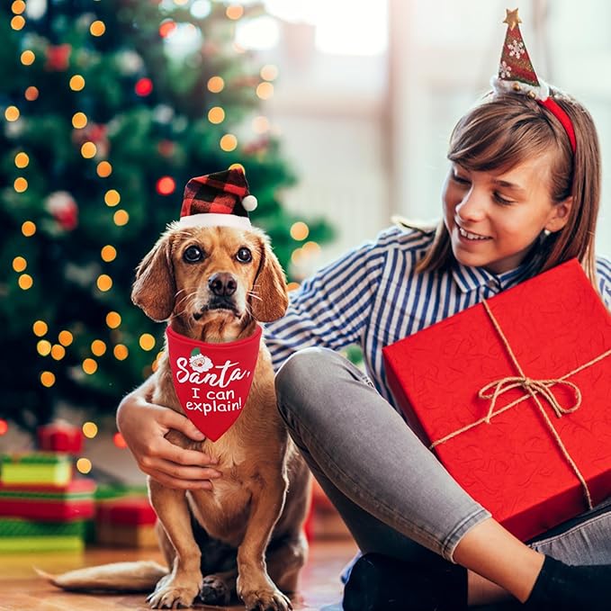 - Package: 1 pc bandana+1 pc hat. Great idea to dress up your dog for Christmas, great affordable present for your furry friend. Wear them and your dog can become the focal point of the party
