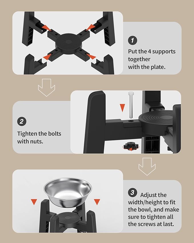 - [Easy Assemble and Use] You could assemble and adjust this CZPET raised bowl only by hand! Once you get the pet bowl stand, you just need to tighted the screws by hand. Then you will finish the assembly within 5 minutes. If you want to adjust it to fit different bowls, all you have to do is just loosen the screws by hand and then adjust freely.