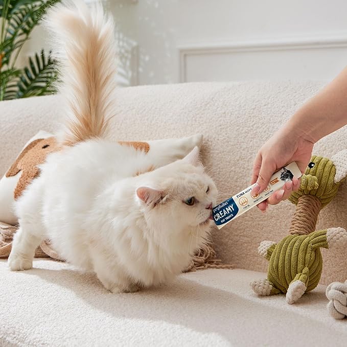- Portable & Convenient: This variety pack puree cat treat comes with 20 tubes, 5 tubes per flavor (0.5oz/14g each). Designed with a long, slim strip package, our squeezable cat treats are highly portable—perfect for taking on walks, trips, or outings to reward your cat on the go. The package of our cat tube treats is easy to open, letting you quickly serve treats anytime and anywhere.