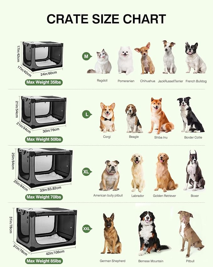 - Designed for Travel: This portable travel dog crate features a soft-sided, foldable construction that easily collapses into a compact package. It includes a convenient storage bag, making it effortless to carry on outings and adventures. Whether you're using it as an outdoor dog kennel or for travel, this crate ensures ease and convenience.