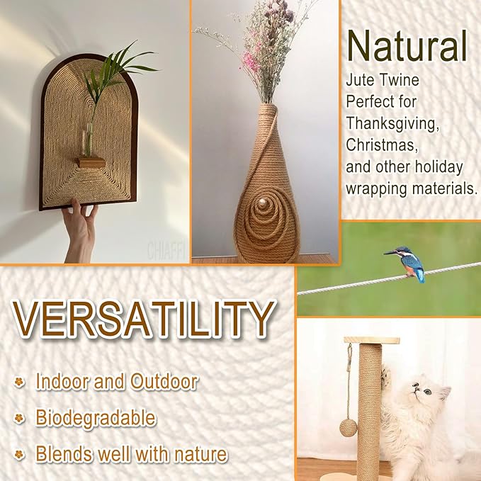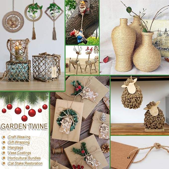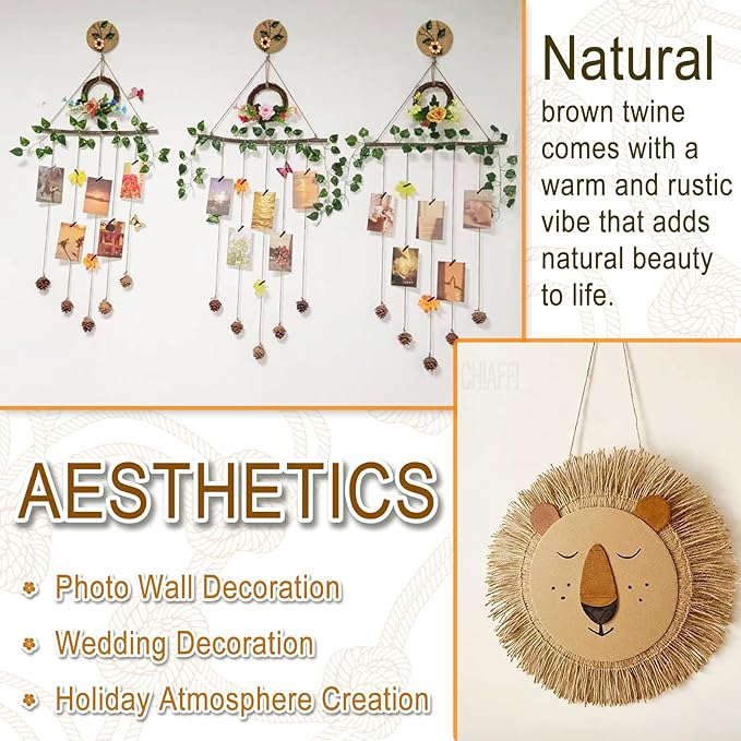 - AESTHETICS - Make a pretty gift wrap, gift card string, photos string, art crafts and DIY projects - such as bracelets and necklaces. For wedding, birthday, baby shower and more, to create a handmade rural style decoration. Natural Jute Twine Perfect for Thanksgiving, Christmas, and other holiday wrapping materials.