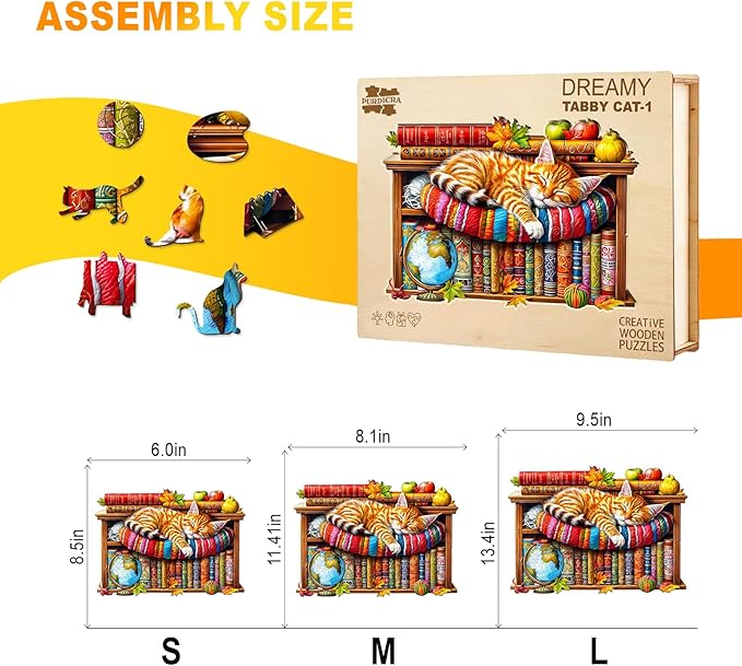 - Tabby Cat Wooden Puzzle: This wooden jigsaw puzzle takes inspiration from nature, featuring irregularly shaped animal pieces. The original hand-drawn designs not only provide a puzzle-solving experience but also serve as unique home décor