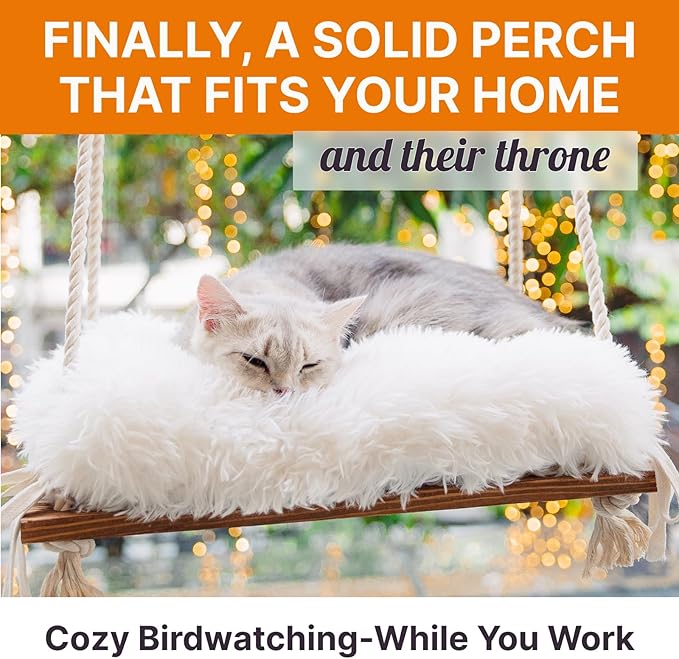 Cat Window Perch - Hammock Bed for Cats Inside - Solid Wood Seat, 4 Strong Suction Cups, Soft Cushion - Rustic Indoor Pet Shelf