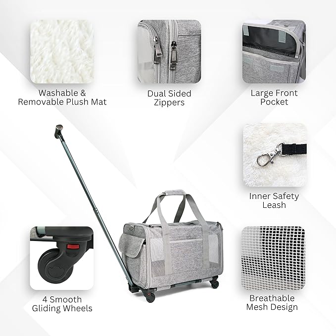 Pet Carrier With Wheels for Dogs Up To 15lbs – Airline Approved Dog Carrier - Rolling Pet Carrier w/ Removable Wheels & Washable Plush Mat – Cat Travel Carrier w/ Telescopic Handle & Shoulder Strap