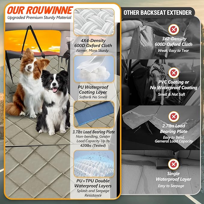 - 【STURDY MATERIAL AND NON-SLIP】 ROUWINNE backseat extender for dogs adopts premium material with 7 layers. First 4X4-density oxford cloth better than other 3x2-density in the market, more sturdy and easy to clean. PU Coating Layer is the first waterproof layer, Softer and no smell. And Paired with TPU waterproof layer, double waterproof layer better than other one layer waterproof layer. Bottom non-slip dot rubber makes dog cover more secure, preventing your dog from slipping.