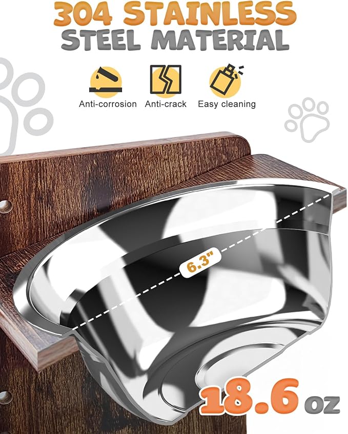 - Sturdy & Easy to Clean: The elevated dog bowl is durable and odor-free. It comes with two stainless steel bowls, each with a 6-inch inner diameter, suitable for various types of pet food and water. The bowls are dishwasher safe for easy cleaning.It should be noted that our dog bowls stand cannot be in contact with water for a long time. Try to wipe off the remaining water on the surface of the dog bowl after cleaning.