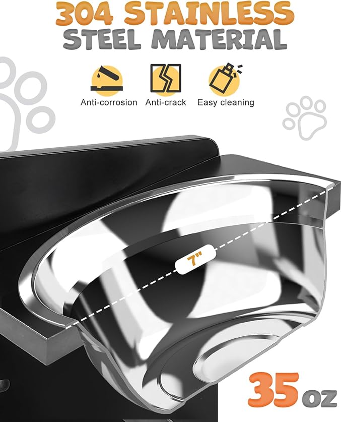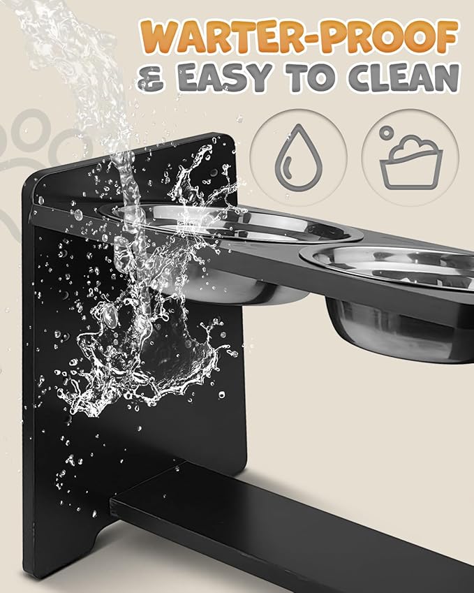 - Sturdy & Easy to Clean: The elevated dog bowl is durable and odor-free. It comes with two stainless steel bowls, each with a 6.3-inch inner diameter, suitable for various types of pet food and water. The bowls are dishwasher safe for easy cleaning.It should be noted that our dog bowls stand cannot be in contact with water for a long time. Try to wipe off the remaining water on the surface of the dog bowl after cleaning.