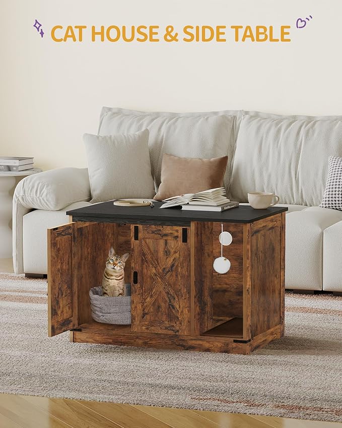 Cat Litter Box Enclosure, Hidden Litter Box Cabinet Furniture with Bell, Indoor Cats House, Farmhouse Style, 31.5 x 19.7 x 20.9Inches, for Hallway, Bedroom, Rustic Brown and Black CB82401X