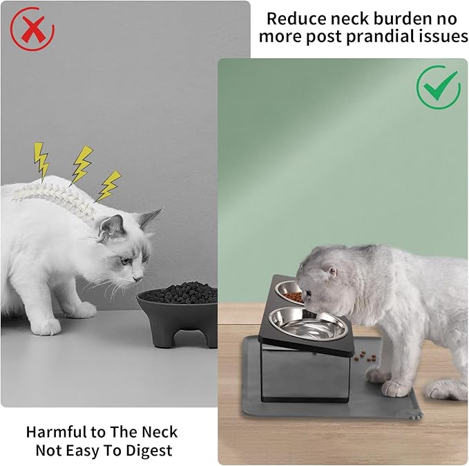 Upgraded Elevated Cat Bowls with Food Mat,15°Tilted Stand Anti Vomiting Raised Cat Dishes for Food and Water,2 Stainless Steel Bowls for Cats and Puppy(Black)