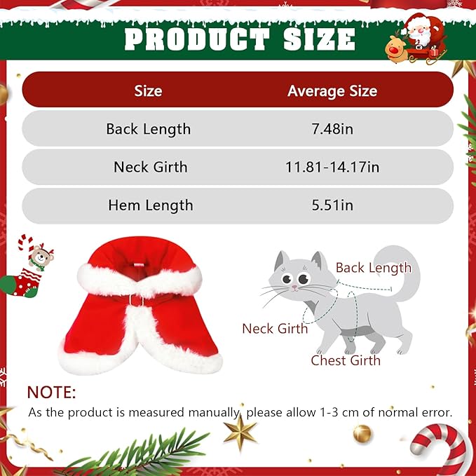 - 【Poncho Size】 This Christmas cat poncho has a back length of 7.48in, a front hem length of 5.51in, and a neck circumference of 11.81-14.17in, suitable for most cats and small dogs. Please refer to the size chart and measure your pet's size before purchase to choose the correct size.