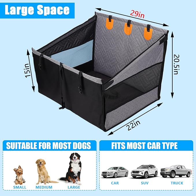 - Mesh Windows and Storage Pockets: There are mesh Windows on both sides of the dog car bed for good ventilation and heat dissipation, there are two mesh storage bag in the front for you to put dog toys and dog food in