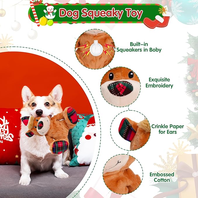 - Dog's Christmas Gift: Christmas is coming soon, hurry up and prepare a surprise for your pet. Make your canine's Christmas extra special with our reindeer dog squeaky toy! several Christmas toys selected by us for you chose. This plush stuffed squeaky toy is a perfect gift choice for your furry baby, will bring endless smiles and lasting happiness to all.