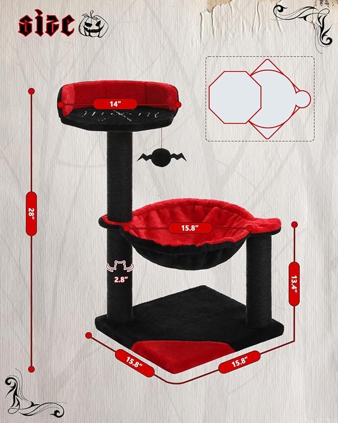 - Halloween Decor: Unleash the Halloween spirit with our black and red Gothic-themed cat tree! This striking cat tree not only serves as a perfect Halloween decoration, transforming your home into a festive haven, but also provides endless entertainment for your furry companion. The eerie yet stylish design seamlessly blends with your Halloween décor, creating a whimsical atmosphere that both you and your pet will love. Treat your kitty to a hauntingly delightful experience this Halloween!