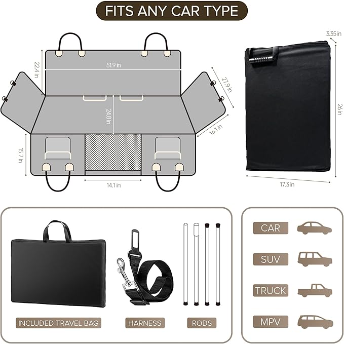- HEAVY DUTY RODS AND HARD BOTTOM CAR SEAT COVER FOR DOGS - With an unparalleled combination of three robust support rods and an extended base plate, back seat extender for dogs fortified your car's back seat into a spacious cabin with safety framework that maximizes space utilization by 99%. This isn't just a dog bed for car it's a pet safety cabin that sets the gold standard in the dog hammock market and designed to redefine the way your furry friend experiences every road trip