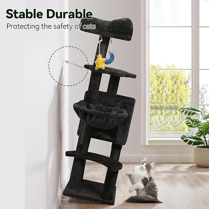 - 【All-in-one Cat Playground】This cat tree tower provides various features to satisfy your cat's needs. It includes sisal rope-covered scratching posts for different scratching habits, a multi-level climbing structure designed for multi-cat households, plush toy balls for interactive play, a soft cat condo to hide in,and a warm hammock for resting and sleeping
