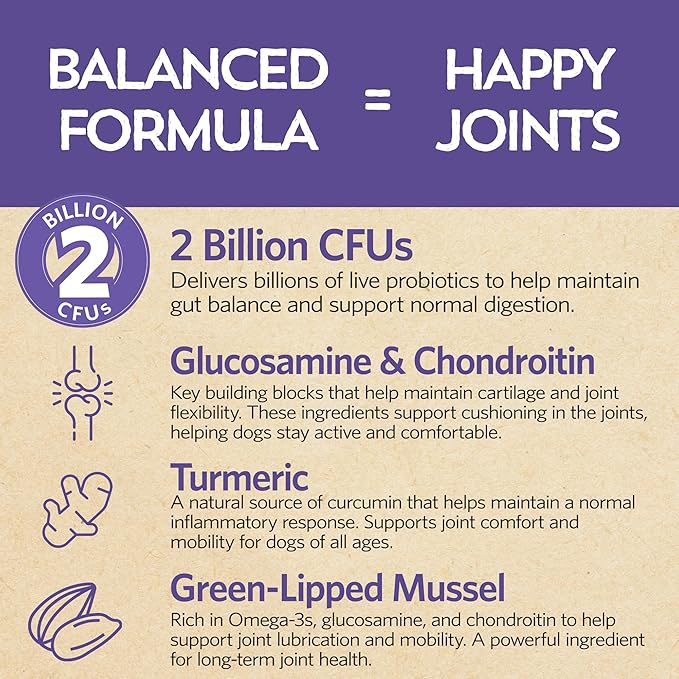 - HIP AND JOINT SUPPORT: Whether your pup loves zoomies or naps, their joints need support. Glucosamine, chondroitin, MSM, and green-lipped mussel help maintain mobility, flexibility, and cartilage, so they stay active and comfortable at any age.