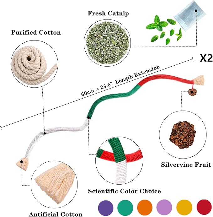 - Silvervine Fruit Catnip Bag: The silvervine sticks for cats can also help solve problems such as chewing, separation anxiety, long teeth, boredom, weight management, running training. 98% of cats like this cat toy very much. Some cats need to be warmed up, you can interact with the cat to attract the cat to play. We added a catnip bag to each package attached to cat rope and stick .Please don't worry, which will disappear in about 30 minutes without any harm to the cat. Use it 2-3 times/ week