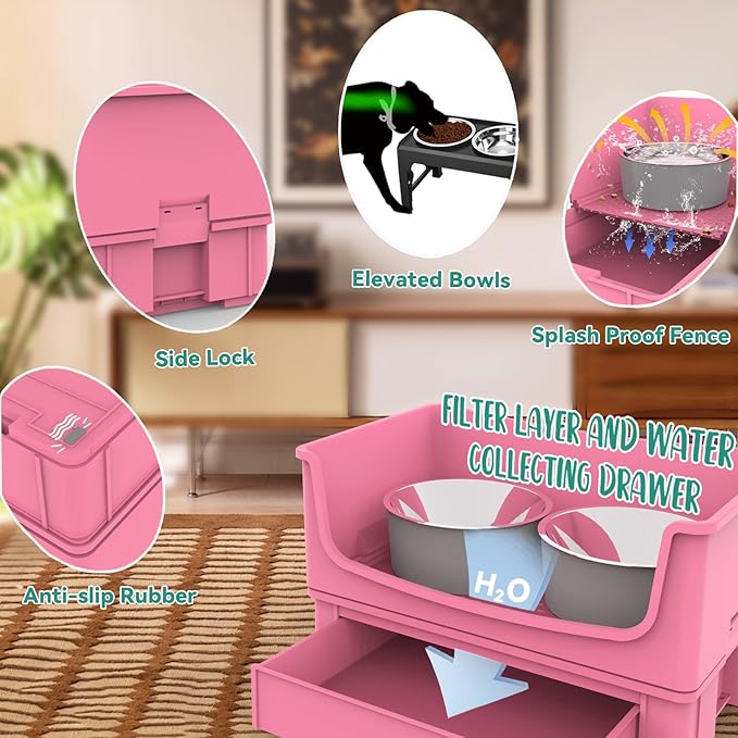 - Higher Fencing Design: The innovative design has raised the height of our no mess dog food and water bowl fence to 6.3 inches, which is more effective in preventing liquid splashing and keeping the floor clean compared to regular dog bowls. Even if your pet drinks and eats fiercely like a bulldog, it will be blocked and perfectly collected at the bottom through a middle interlayer.