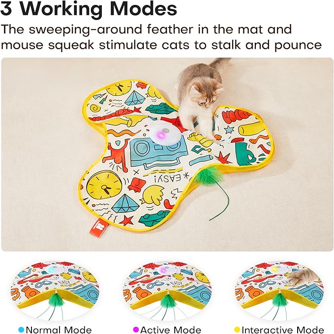 - Smart Motion Sensor & Three Modes – Equipped with intelligent touch activation, this electronic toy allows your cat to self-play by simply touching the toy. Choose from three adjustable modes: normal, active, and interactive, keeping your cat energized and reducing boredom for hours of indoor fun and enrichment.
