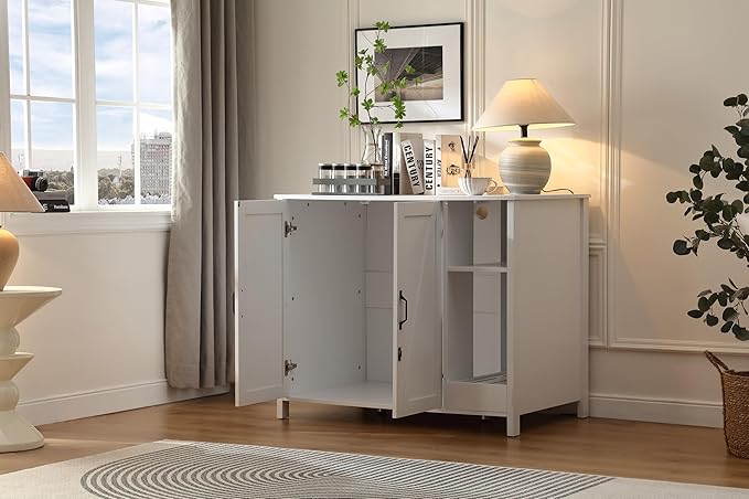 Large Cat Litter Enclosure with Litter Collector, Enclosure for self-Cleaning Litter Boxes,Adjustable Shelf for Dog Proof,Charging Station,Locks Added for cat,Cat House,Cloud White