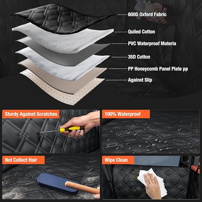 - 【Waterproof & against Scratches and Wear Material】Made from durable ABS, nylon, and Oxford cloth, this dog car seat cover is waterproof, against scratches, and built to last. It protects your car’s seats, doors, and windows from muddy paws, pet hair, and unexpected messes, ensuring your vehicle stays clean and tidy after every trip with your pet.