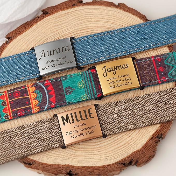 - Cute Font Design Silent Pet ID Tags - A well-designed cute fashion name tag for your beloved dog, cat, or other pets. No Jingling fabric band that is safe and soft. laser engraved stainless steel pet tags with your pet's name and contact information. Handmade with love.