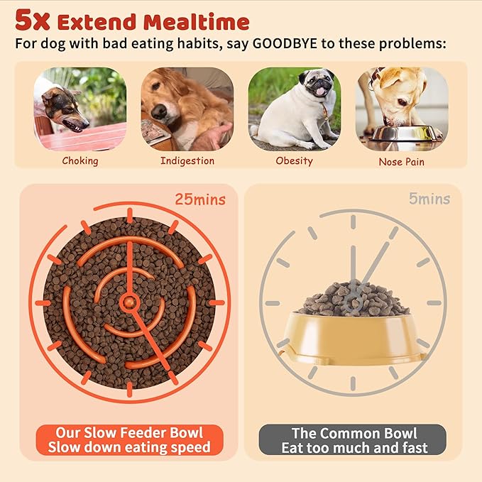 - Prolong The Mealtime to 5 X - Help to reduce the chances of dog gulping, choking, vomiting, bloating and getting obesity. The slow eating dog bowl encourages paced eating while satisfies dog’s natural foraging instinct, healthier for dogs.