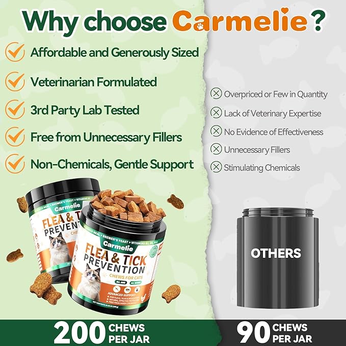 - Natural Flea and Tick Treatment for Cats: Tired of dealing with fleas and ticks on your cat? If you're looking for a more comfortable alternative to collars and sprays, Carmelie’s flea and tick chews are the solution. Made with natural ingredients, these cat flea treatments provide complete protection from the inside out, helping to keep your cat pest-free without the hassle!
