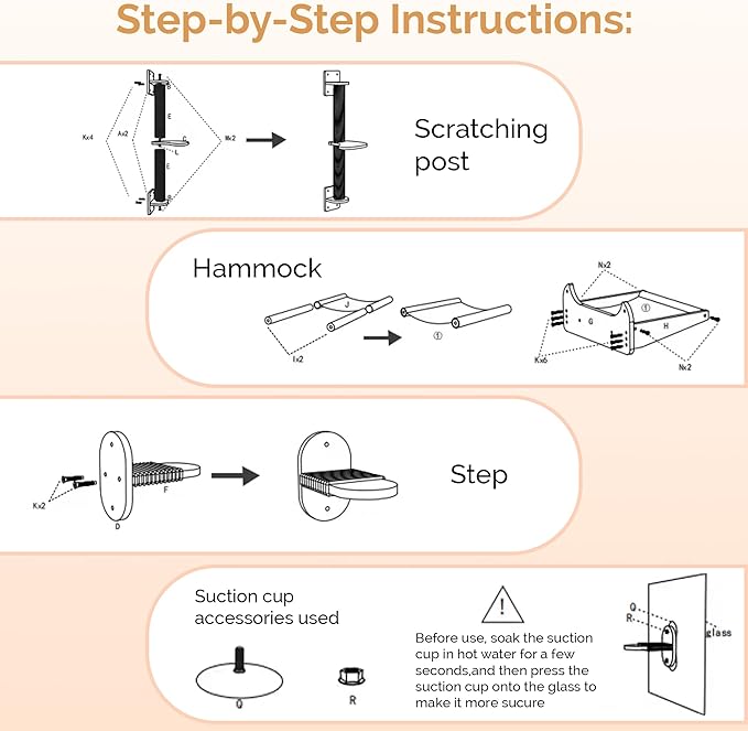 - [How to Use] Easy to follow instructions along with tools and hardware for installation are all included. We recommend using a Phillips-head screwdriver or power drill for wall installations. Apply suctions cups to the surface and press firmly to secure. Watch your cat enjoy! Simply pinch suction cups to remove and relocate. Please note that suction cups are designed for glass/plastic surfaces only. Soak the suction cup in warm water before use. Soft and clean cups will provide the highest level of suction. Cat wall furniture for all ages/sizes up to 25 lbs. Easy Cleaning Instructions: Remove cat hammock and wash under warm water or gentle cycle. Air Dry or Low Heat.