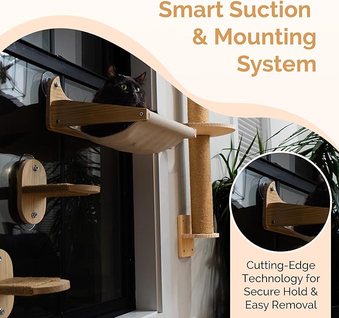 Space Saving Cat Wall Shelves, Window and Wall Mount 4-in-1 Cat Tree – Hammock, Cat Scratching Post, Two Steps with Grips – Natural Pine, Jute Rope – Beige