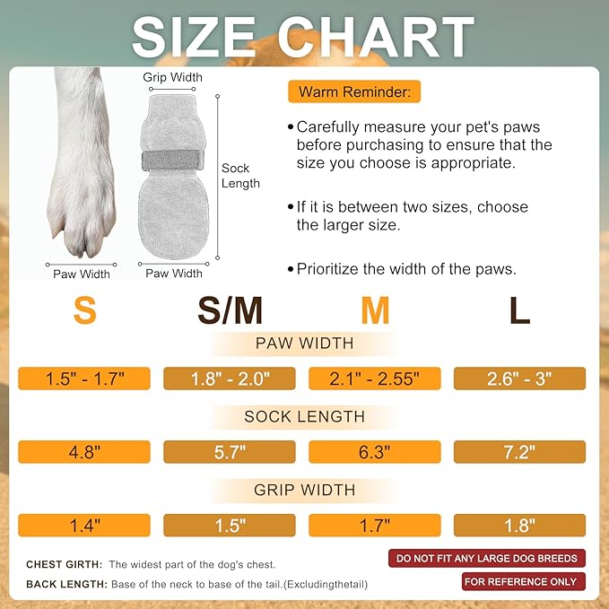 - SIZE MATTERS: Includes 4 dog socks with grippers. 1.8" paw width for size small; 2.1" paw width for size small/medium; 2.55" paw width for size medium; 3" paw width for size large. Be sure to measure your pet before purchasing to ensure a perfect fit. If your dog's paw width falls between two sizes, choose the larger size for a more comfortable fit. Any other questions, please contact us