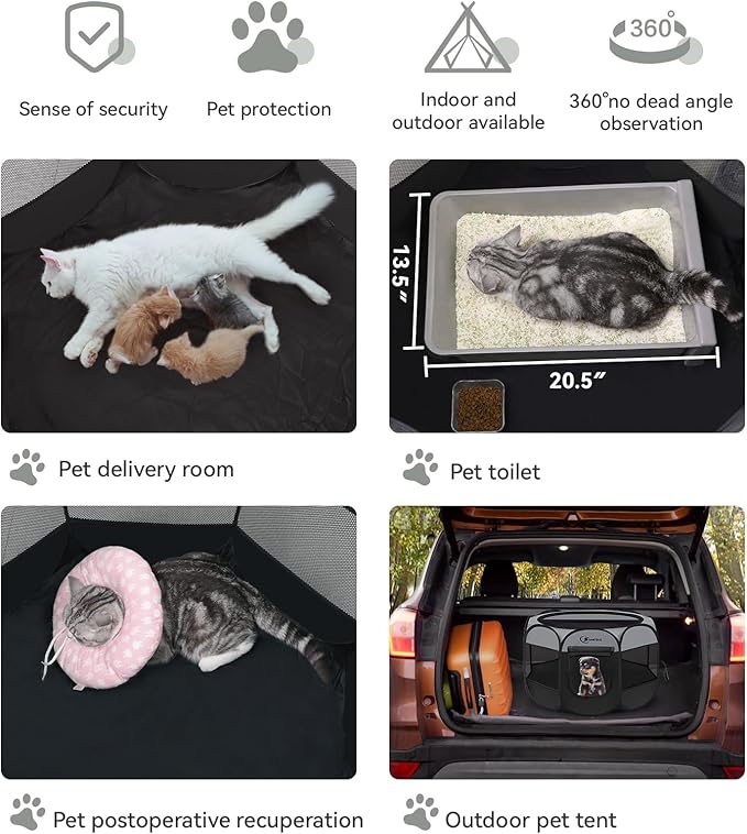 - 【Safe quality material】The pet playpen is made of high-grade thick mesh and 600D polyester Oxford cloth, made of durable waterproof material. Seams and corners are reinforced, not easily damaged by pets. Consists of 8 mesh side panels and a half mesh top, well ventilated. You can have a 360-degree view of your pet's condition, and you can also give your pet a panoramic view of its surroundings.