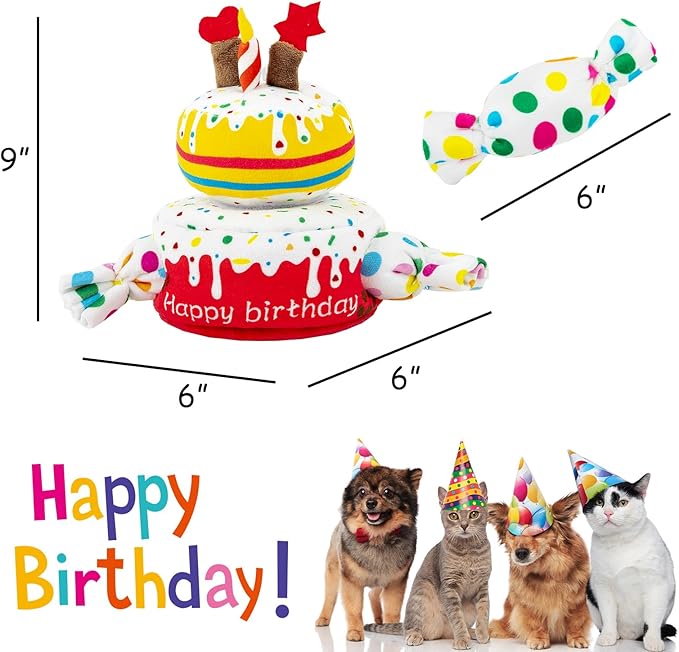 - Funny Dog Toys Great for Multiple Dogs - Cake size: 6 x 6 x 9 inches, Candy size: 6 inches. Two-layer cake and three candy toys included, each puppy chew toy has one round squeaker. Prefect dog toys for large dogs and good traing toy for puppies small, medium and large dogs