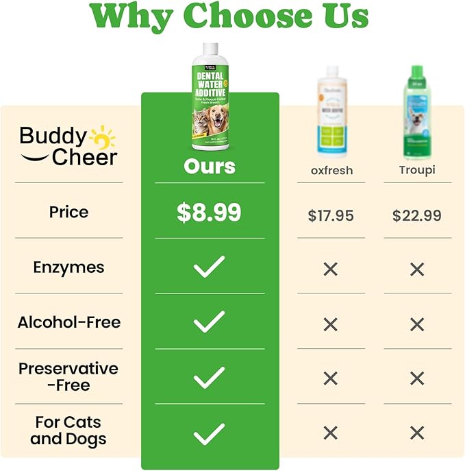 - 【Fights Plaque & Tartar】 Packed with powerful enzymes that break down plaque and tartar, this dental care water additive helps keep your pet’s teeth cleaner and healthier over time. No more worrying about buildup—just sip and smile!
