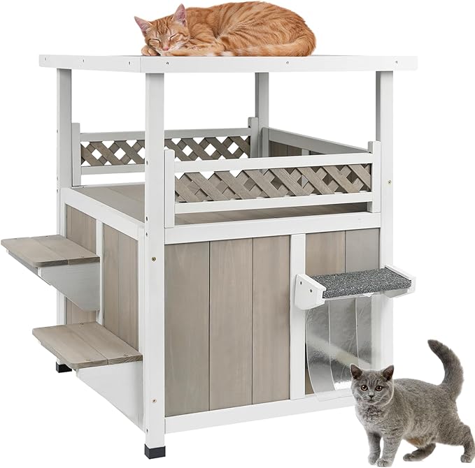 - Two-Story Outdoor Cat House for Feral Cats:Our wooden two-story cat house features an upper level as a large balcony ,to private retreat and playground for your feline friend, and a lower level equipped with a spacious and cozy rest area. Here, your cat can indulge in sunbathing, enjoy the scenic view out the window, and relax in nature's embrace.