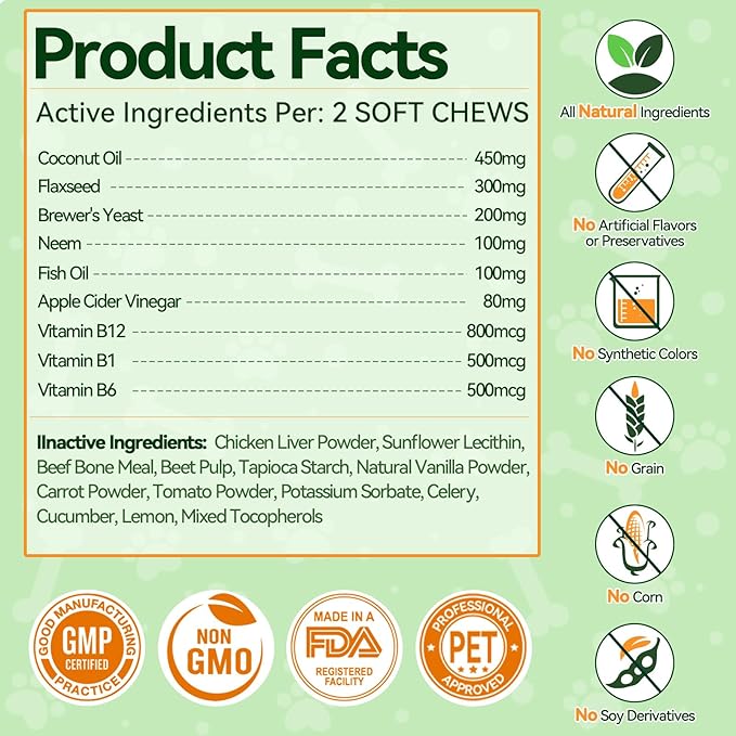 - Healthy Skin & Coat: Our natural formula helps address issues like irritation, dryness, and itching caused by flea, while enhancing your dog's overall appearance. Enriched with natural ingredients like Coconut Oil, Fish Oil, and Neem, these flea soft chews promote healthy skin and a shiny coat. Vitamin B12, B1, and B6 help nourish the coat from the inside out. They're free from grains, corn, and soy derivatives, ensuring a natural and safe solution for your pet.