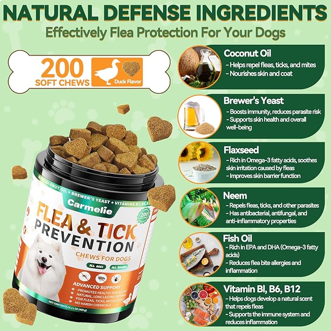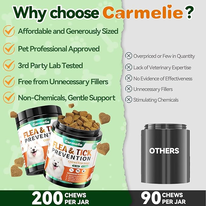 - Effective Health Support: Carmelie flea and tick chews are made with only natural ingredients to ensure the safety of your beloved pet. Each soft chew is rich in coconut oil, garlic powder, flaxseed, and brewer’s yeast, and free from harsh chemicals or artificial additives. Whether for puppies or senior dogs, they can safely enjoy these chews while benefiting from multiple health supports, from flea control to skin care.