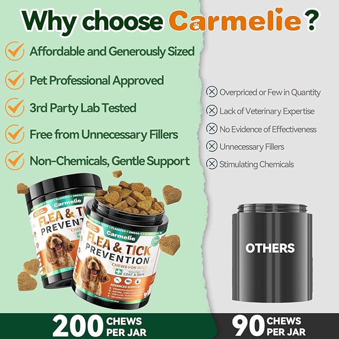 - Effective Health Support: Carmelie flea and tick chews are made with only natural ingredients to ensure the safety of your beloved pet. Each soft chew is rich in coconut oil, garlic powder, flaxseed, and brewer’s yeast, and free from harsh chemicals or artificial additives. Whether for puppies or senior dogs, they can safely enjoy these chews while benefiting from multiple health supports, from flea control to skin care.