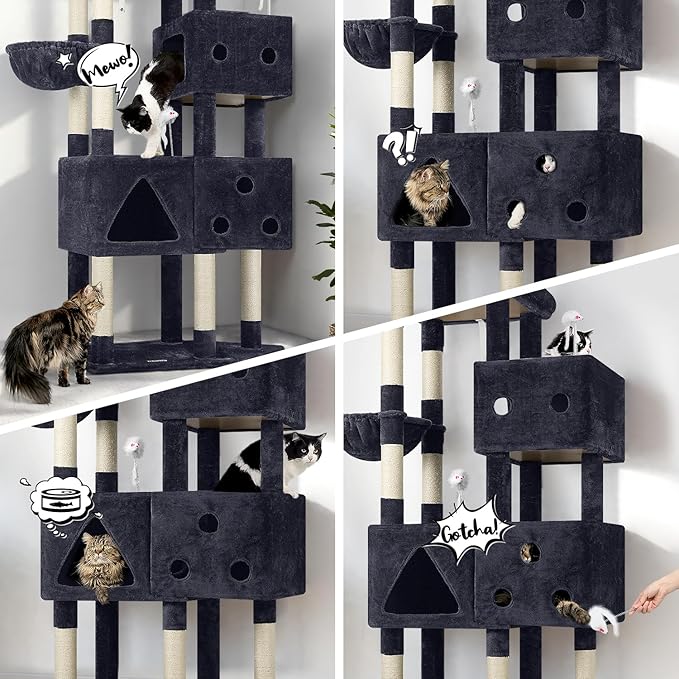 - Multilevel and Multispace: This cat tower for indoor cats is 81 inches high and features a multi-level cat tree design, allowing cats to jump between different heights, exercise, and stay active. With 2 platforms, 3 cat condos, and 1 hanging basket, it provides a variety of play areas that make it perfect for 20lbs large adult cats